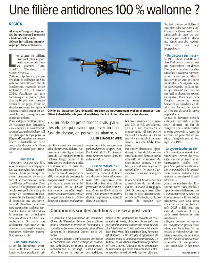 Dans ce contexte, la proposition visant à structurer une filière wallonne dédiée aux technologies liées aux drones et à leur neutralisation me paraît non seulement pertinente, mais nécessaire. Nous disposons déjà en Wallonie des compétences, des technologies et des acteurs industriels et académiques capables de répondre à ce défi. Ce qu’il nous manque, c’est une organisation claire, une vision commune et une capacité à coordonner ces forces.