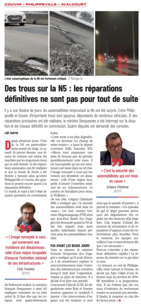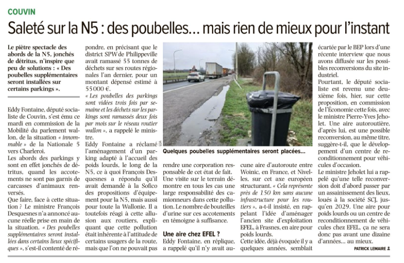Je me suis récemment inquiété de l’état inacceptable des abords de la N5 vers Charleroi, où les parkings et accotements sont envahis de déchets. La réponse apportée par le ministre, qui se limite à l’installation de quelques poubelles supplémentaires, me paraît largement insuffisante face à l’ampleur du problème. Avec François Desquesnes, nous avons échangé sur la situation, et j’ai insisté sur la nécessité d’aller plus loin. Selon moi, il faut s’attaquer aux causes structurelles, notamment le manque criant d’infrastructures pour les poids lourds sur cet axe. Entre Woinic et Nivelles, il n’existe aucune aire adaptée sur près de 150 kilomètres, ce qui contribue directement à ces comportements problématiques.