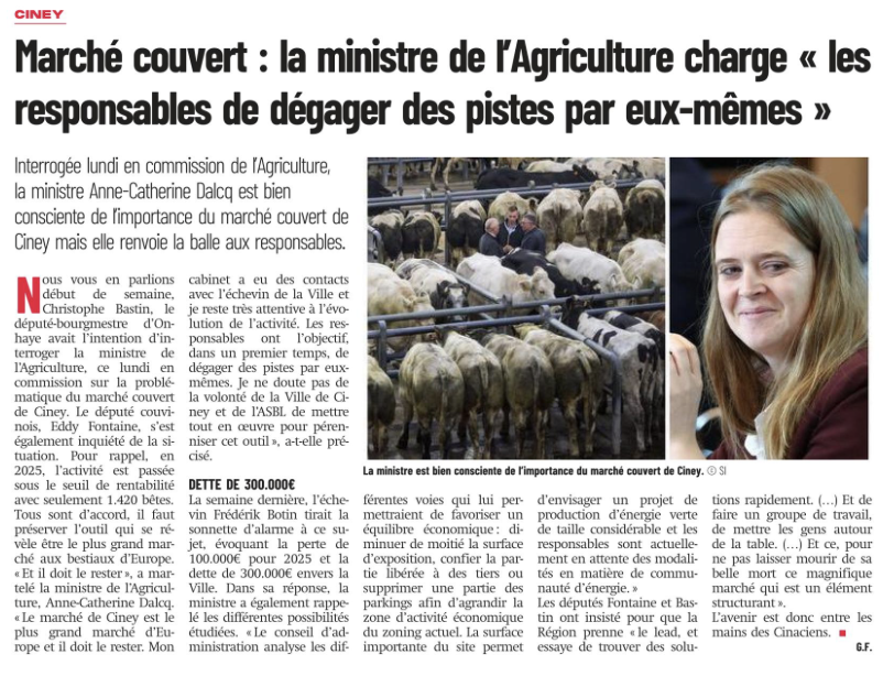 Je suis particulièrement inquiet de la situation du marché couvert de Ciney, un outil économique majeur qui a vu son activité passer sous le seuil de rentabilité. Ce marché, qui est le plus grand marché aux bestiaux d’Europe, joue un rôle structurant essentiel pour toute la filière agricole, et il est impératif de le préserver.