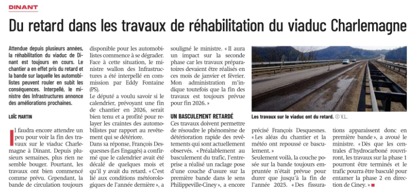 Je suis intervenu concernant la situation du viaduc Charlemagne à Dinant, où les travaux de réhabilitation accusent un retard et où la bande de circulation encore utilisée par les automobilistes se dégrade de plus en plus. Il était important pour moi de relayer les inquiétudes des usagers et de vérifier si le calendrier initial, qui prévoit une fin de chantier en 2026, serait respecté.